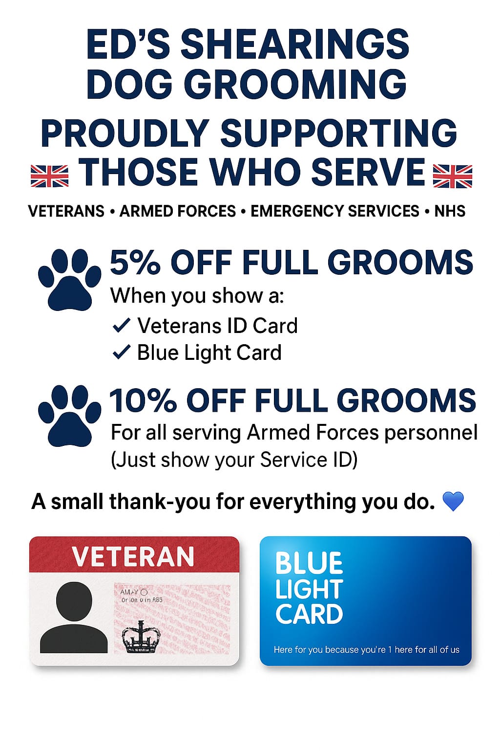 5% off Top Dog Transformation and Deshed Service with Blue Light Card and Veteran Card (NHS staff cards not accepted) .